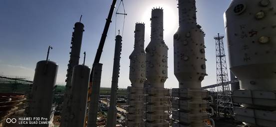 七月的驕陽似火,興華科技公司聯堿現場的設備安裝也正在經受這盛夏的考驗,炎熱的天氣,擋不住興華科技員工的工作熱情,經過前期的精心準備,由三門峽化機制造的聯堿大型塔器碳化尾氣凈氨塔、濾過尾氣洗滌塔、濾過尾氣凈氨塔、和淡液蒸餾塔以及煅燒爐氣洗滌塔等塔陸續進廠,經過相關部門領導的統籌協調,分兩次將7臺大型塔器全部安全吊裝到位,至此聯堿重堿現場的所有塔器全部安裝完成,為下一步的管道安裝打下了堅實的基礎。